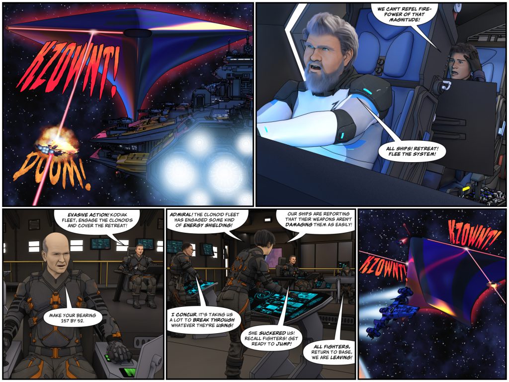 On the Kodiak 2, Admiral James Anchor gives orders for his fleet to protect the transports while they make preparations to retreat. However, word starts coming in that the Clonoids have now engaged some kind of energy shielding! This whole battle was a trap!