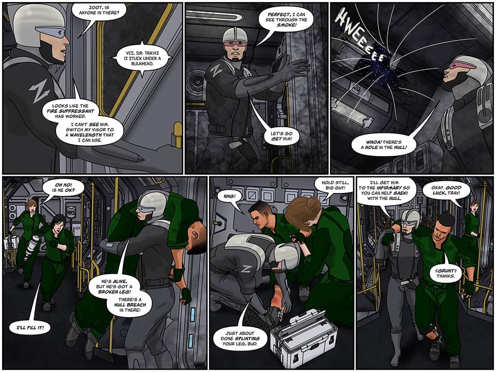 Zik looks through the window into the room with the fire. His trusty colony computer Zoot informs him that there's still someone in there, stuck under a bulkhead! Your favorite space hero adjusts his visor to display a light wavelength that can help him see through the smoke, and he enters the room. Inside, he stares out into open space through a big hole in the hull! Uh oh! He grabs Travis and gets him out of the room. As he exits, Leslie and Saeki come charging onto the scene. Zik allays their fears for their fellow engineer Travis, and informs them of the hull breach. Saeki dashes into the room to fix the hole while Leslie helps Zik set the fracture in Travis' leg. Once the splint is in place, Zik helps Travis to the infirmary while Leslie stays behind to help repair the damage to the Kodiak.