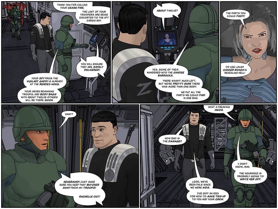 During the prisoner transfer negotiations, Captain James Anchor thanks Rachelle for calling for a cease-fire. He gives her an update on the status of the survivors and assures her that they will be returned safely. Rachelle is a little concerned when she learns that some of her troopers hare returning in pieces, not all of which are accounted for with certainty! James explains that several troopers wandered into a Chadee barracks, and they didn't last long against the legendary battle-fury of the Chadee! Muttering a barely-intelligible curse in reply, Rachelle seems beyond furious, and soon signs off.