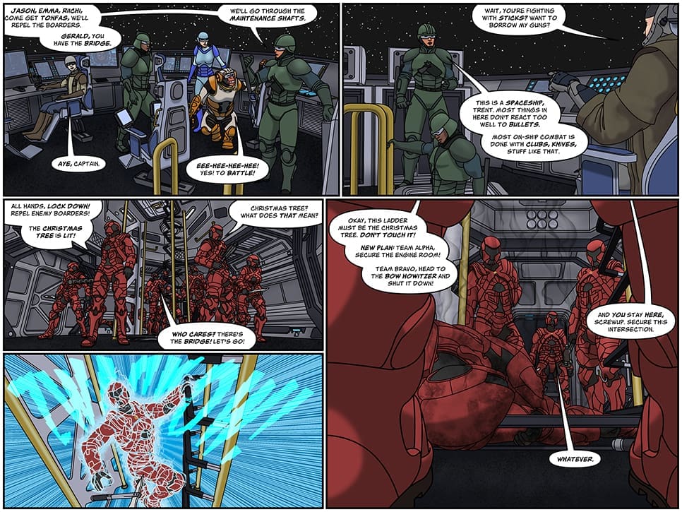 The Jairians quickly adapt to their new circumstances. If you can't take over the command center of a ship, take over engineering! From there, you can override any propulsion commands, as well as disable the life support for the bridge crew! The lead Jairian instructs his team: some will head aft to engineering, some will head forward to disable the second howitzer. One of them, a "screwup," is told to stay behind and guard the intersection, something he's not happy about!