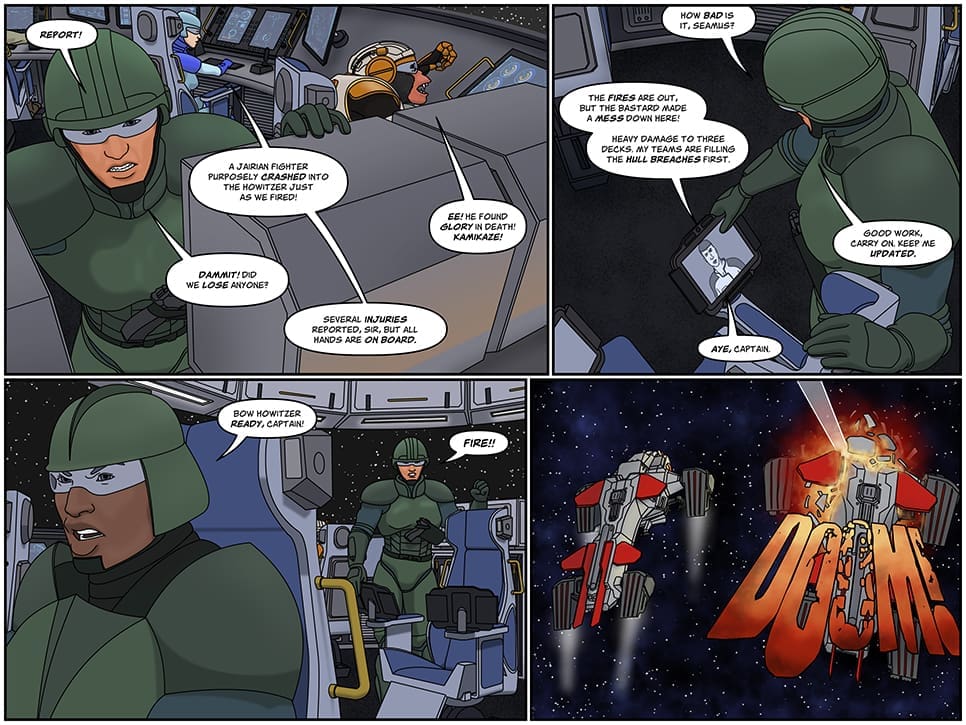 James Anchor gets a damage report from his crew! The damage is as bad as it looks, but at least they didn't lose anyone to death or space! Between reports from Chief Engineer Seamus and Tactical Officer Emma, the captain gets up to speed. Then Jason announces that the bow howitzer is ready. He hasn't wasted any time cycling up the weapon and locking it on to its Jairian target! Captain Anchor orders him to fire! The second breacher bites the dust!