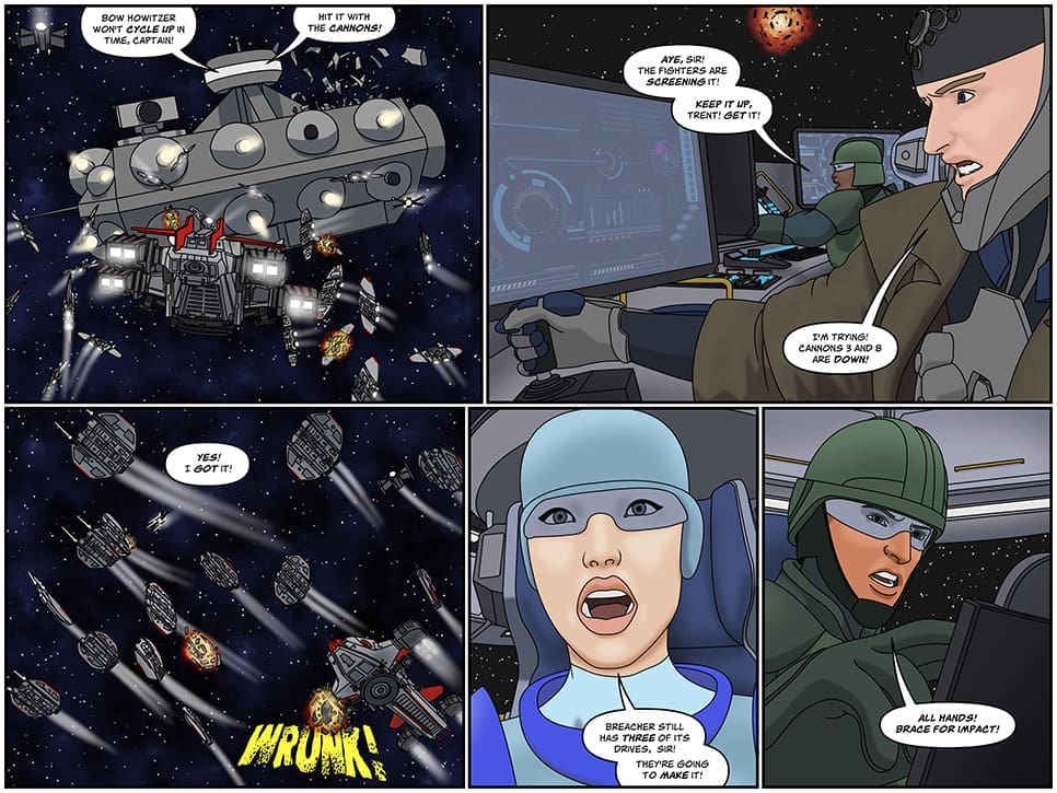 Following Rachelle's battle plan, the Jairian fighters crowd the space between the breacher and the Kodiak. They take heavy losses, but they're able to shield the breacher from the big guns! A frustrated Trent is seeing his cannons go inexplicably offline one by one. Despite that, Trent manages to damage the incoming breacher! One of the drives gets blown to bits. But it's not enough; it still has three drives! James Anchor informs the crew: prepare for impact!