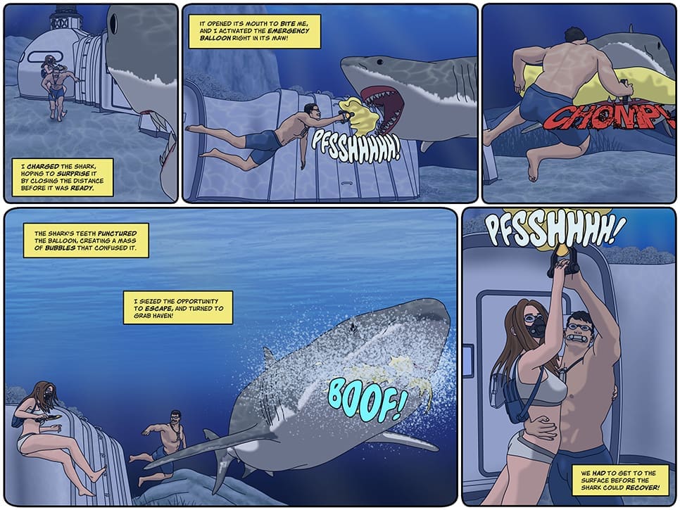 Always the man of action, your favorite space hero Zik charges at the shark! His hope is to get close to it before it expects him and inflate the balloon in its mouth. His ploy works, and the mighty shark chomps the inflating rescue balloon with such force that it bursts. A mass of bubbles to sprays out, confusing and disorienting the great white. Zik seizes the opportunity to escape, grabbing Haven and inflating her rescue balloon!