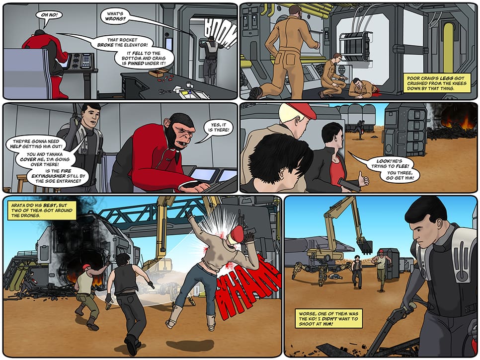 While Zik hammers away with his shotgun, Arata sees the damage the rocket has done on his security monitors. As it turns out, the main elevator for the mine was damaged! It fell all the way to the bottom, bouncing out of its shaft and crushing the legs of one of the miners at the bottom! Zik hurries over to get a look at what's going on. He sees right away that the miners are going to need help to free the poor man. He grabs a fire extinguisher and charges out of a side door, heading for the burning elevator building! But Morren has spotted Zik and sends three of the Jairians after him! One gets stopped cold by the digger drones, but two more make it past! Worse, one of them is the kid, and Zik certainly doesn't want to hurt him!