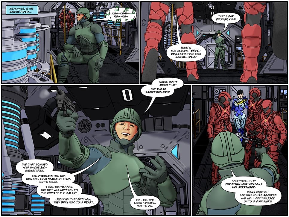 But Captain Anchor has a little surprise for them - he draws his gun and points it right at them, finger on the trigger! The Jairians are stunned. No one shoots guns on a spaceship, especially not in an engine room! Doing so is a really good way to blow yourself up! They call James' bluff.