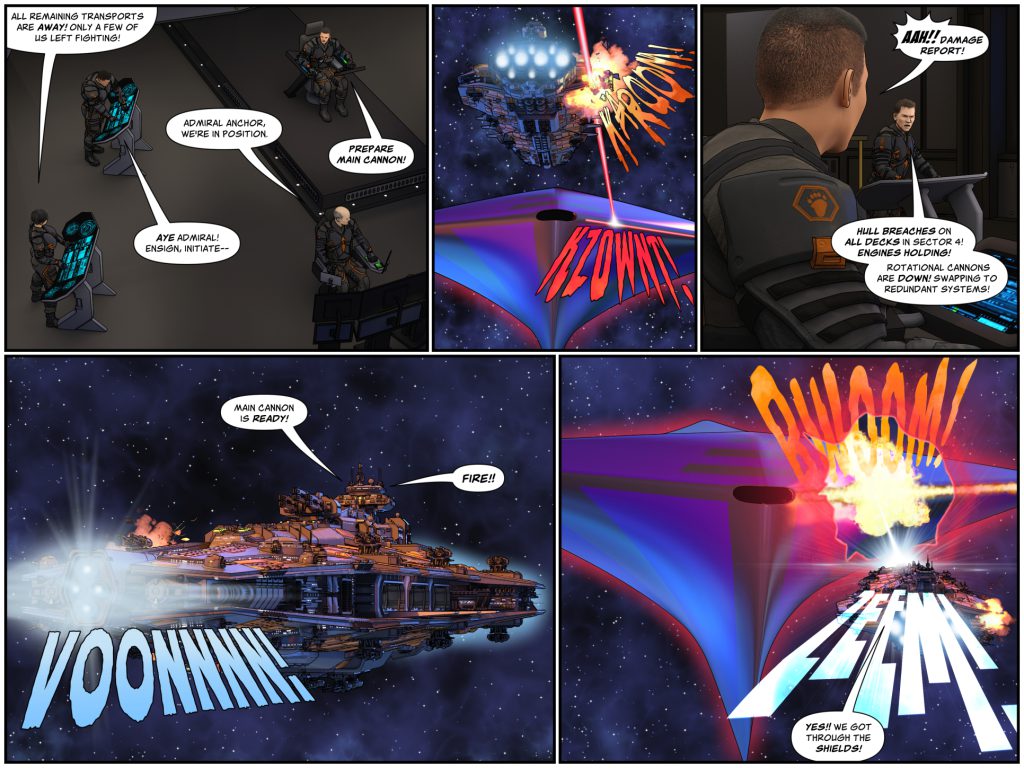The main cannon, however, was unaffected by the massive explosion, and Jason reports that during the chaos, his crew finished the massive energy ramp-up required to fire the weapon. James gives the order and the incredibly powerful quad-railgun unleashes its shells at sizeable fraction of the speed of light! The force is powerful enough that they manage to penetrate the powerful shields protecting the Varanus, and they score a direct hit on her port laser array! There’s a huge explosion as the entire array is obliterated!