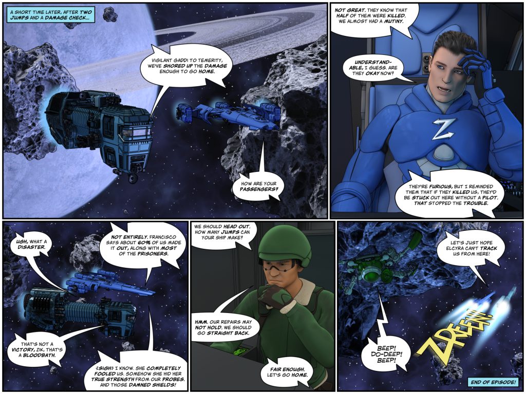 In due course, Ramesh radios over to say that they’re ready to go. Zik asks how the refugees are holding up, to which Ramesh reports that they’re furious enough to have nearly staged a mutiny. Only being reminded that they would be stranded in space without a pilot calmed them down. The two old pals then review the battle; Zik tries to keep positive about it, but Ramesh is more of a realist than an optimist, and points out that a 60 percent survival rate isn’t exactly a victory. Conceding the point, Zik admits that Elcyra seems to have duped the Zozians into attacking, before springing the trap with her insanely powerful capital ship. The Zozians have achieved a pyrrhic victory, and have gotten a rude awakening about how far the rest of humanity have advanced technologically in the past thousand years!
