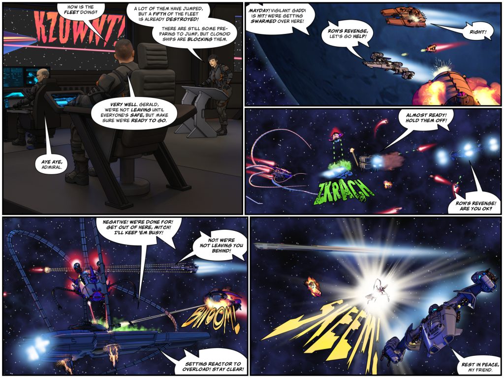 Meanwhile, in the thick of the dogfight, Defender Zik’s Temerity receives a mayday from Ramesh, who is getting swarmed by Clonoids after being savaged by Queen Elcyra’s massive ship, the Varanus. The Temerity and Ron’s Revenge rush to help, but Ron’s Revenge is hit badly by a Zernab patrol ship’s plasma bolts! As the Temerity rushes around destroying Clonoids, Mitch watches in horror as his old friend’s ship is torn apart by a Zernab ripper ship.  The vessel is lost, but in one last act of defiance, they set their reactor to overload, heroically taking the breacher out with them!